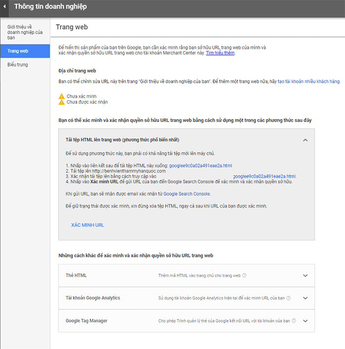 Cách 1:Xác minh bằng việc gắn đoạn mã HTML của Merchant Center lên web theo hướng dẫn (Google khuyên dùng)