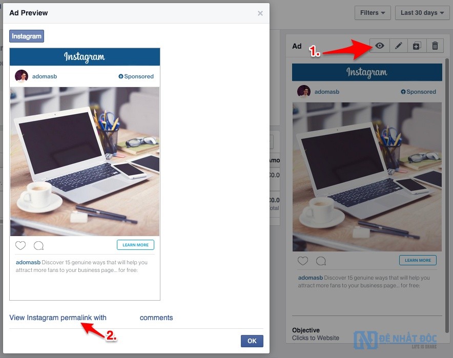 Bạn cũng có thể tìm đường link này trong Ads Manager, chỉ cần xem dashboard, chọn campaign và Ad set, bấm vào mẫu quảng cáo cần xem. Ở góc bên phải trên cùng bạn sẽ thấy một biểu tượng hình con mắt sẽ mở ra cửa sổ xem trước – click vào để xem Preview và lấy permalink.