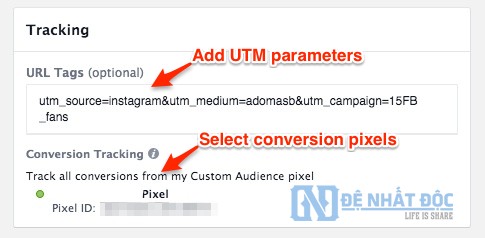 Mặc dù bạn không thể chọn đối tượng quảng cáo là hình thức Websites Conversions nhưng vẫn có thể gắn “conversion pixels” như Facebook Ads vào bất cứ mẫu Instagram Ads nào. Đoạn mã này sẽ giúp theo dõi các hình thức hoạt động của người xem quảng cáo liên kết về websites của bạn. Thêm vào đó, bạn cũng có thể dùng các tham số theo dõi, điền vào mẫu biểu để thêm một lớp tracking nữa. Để tận dụng thì bạn sẽ có thể dùng link UTM để định dạng các biến “source, medium, campaign, content” cho mẫu quảng cáo của mình. Các cấu hình này sẽ xuất hiện trên Google Analytics giúp bạn định dạng chiến dịch tốt hơn.