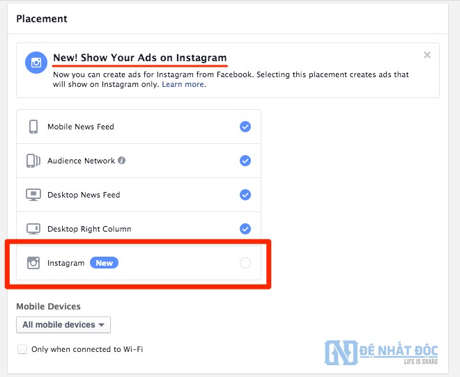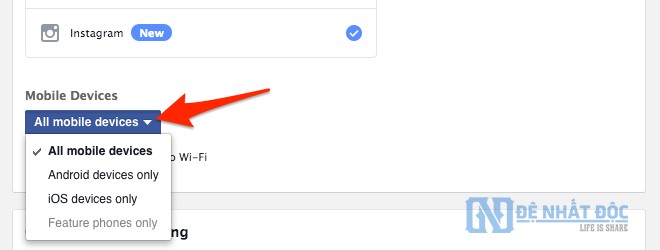 Nếu bạn chỉ muốn quảng cáo trên Instagram mà thôi thì chọn đúng một mục “Instagram” trên bảng Placement. Và điều này cũng có nghĩa bạn không thể chạy quảng cáo trên cả “Mobile News Feed” và “Instagram”. Tiếp tục dùng tùy chọn xổ xuống ở mục Mobile Devices để chạy quảng cáo cho cả hai nền tảng Android và iOS, hoặc chỉ một trong hai.
