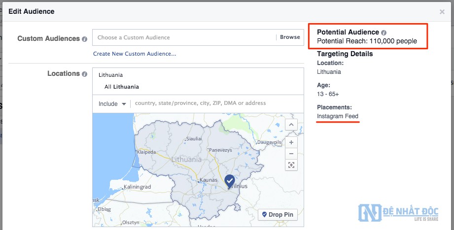 Bây giờ tiếp tục đến với mục Audience. Hiện tại quảng cáo Instagram đã sẵn sàng tại hầu hết các quốc gia dùng Facebook trên thế giới và ta đã có thể thấy được lượng người tiềm năng có thể nhìn thấy quảng cáo Instagram ở mỗi quốc gia (potential reach). Điều này vô hình chung cũng nói cho ta biết có đích xác bao nhiêu người đang dùng Instagram ở mỗi quốc gia, điều cực kỳ tuyệt vời đặc biệt là cho mục đích nghiên cứu thị trường.