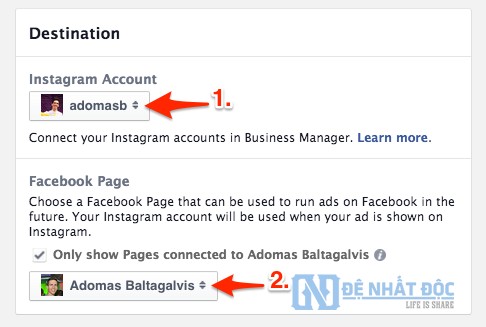 Trước tiên, bạn sẽ chọn đích đến (Destination) cho mẫu quảng cáo: tài khoản Instagram của bạn và Facebook page. Nhớ chọn tài khoản Instagram mà bạn đang dùng vì tài khoản này sẽ được hiển thị cùng với mẫu quảng cáo. Ngay thời điểm này thì bạn chưa được phép chọn quảng cáo cho bất cứ post nào sẵn có trên Instagram mà phải tạo một quảng cáo mới hoàn toàn.