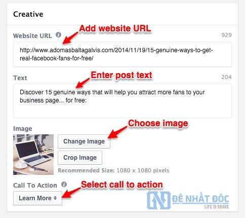 Cuối cùng, chọn mẫu hình ảnh cho quảng cáo của bạn, kích thước chuẩn là 1080x1080px và chọn nút Call-to-action như hình ảnh: