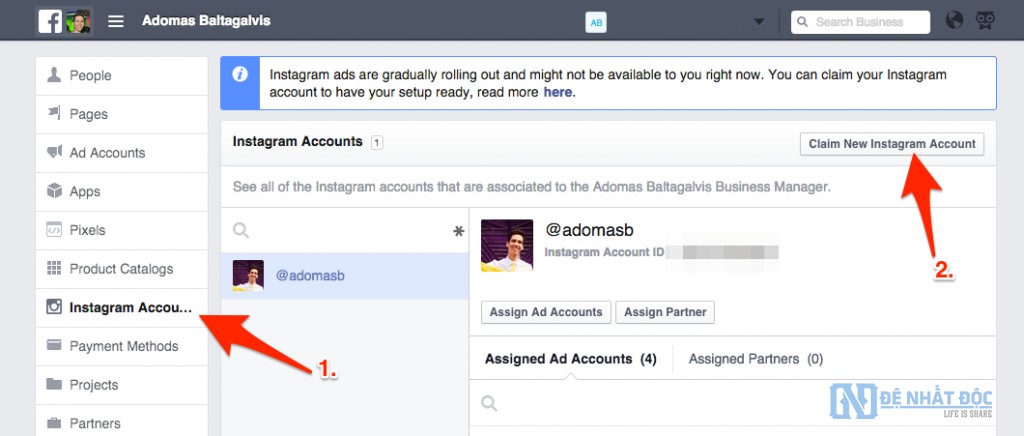 Truy cập vào Business Manager- Chọn “Settings -> Instagram Accounts” (lưu ý nếu không tìm thấy tùy chọn này tức là bạn chưa được Facebook cập nhật chức năng quảng cáo trên Instagram, đành chờ thôi)- Chọn “Claim New Instagram Account” ở góc trên bên phải